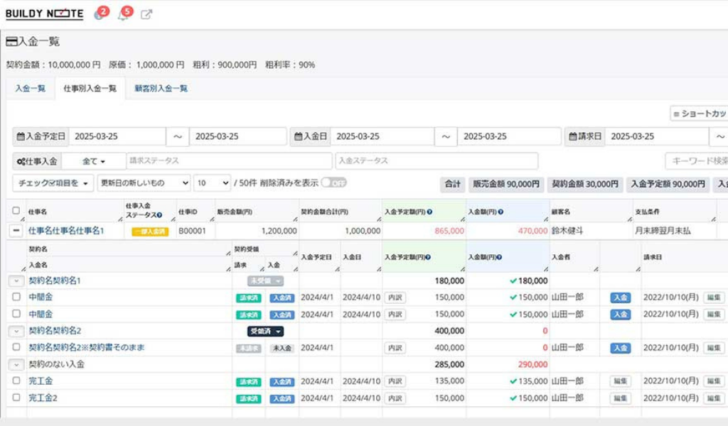 顧客や仕事と入金情報をを紐付けできるので「誰から」「いつ」「何の件で」支払いがあったか一元管理できます。 入金状況も一覧管理でき、回収漏れもなくなります。